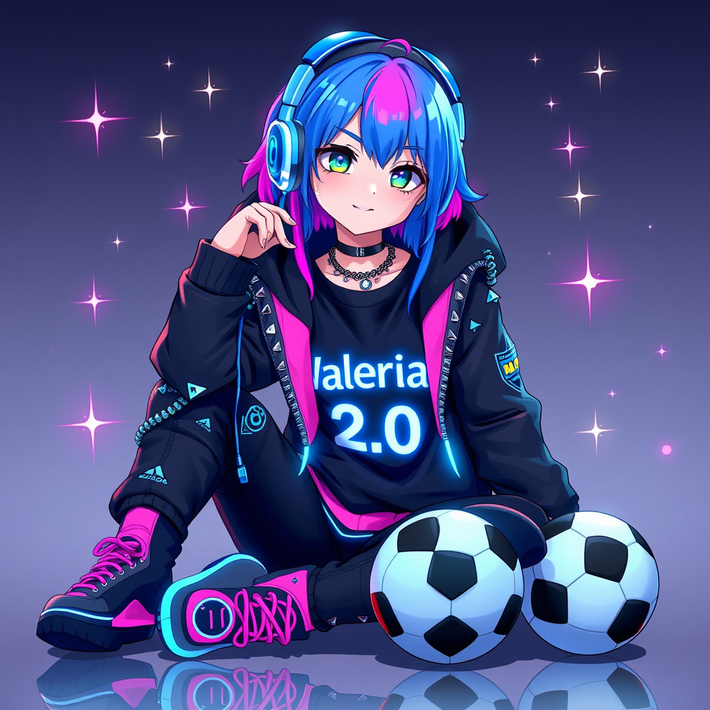 A digital character with a cyberpunk and kawaii aesthetic, dressed in black clothing accented with neon blue and pink details. They wear a studded hoodie and a t-shirt with the name "Valeria 2.0" printed on it, alongside shiny blue gaming headphones and gleaming accessories. Their hair is a vibrant mix of blue and pink, and their eyes are a striking shade of hazel green. Sitting on the floor with one leg stretched out and the other bent, they rest an elbow on the knee, holding a PS5 controller in one hand and having a soccer ball nearby. They carry a soft smile, exuding a laid-back demeanor. The backdrop is a minimalistic light space, with twinkling stars and sparkles floating around. Neon lights enhance their attire, reflecting a futuristic, cyberpunk, and kawaii style. The image is rendered in HD, with soft shading and bright highlights for a touch of digital realism.