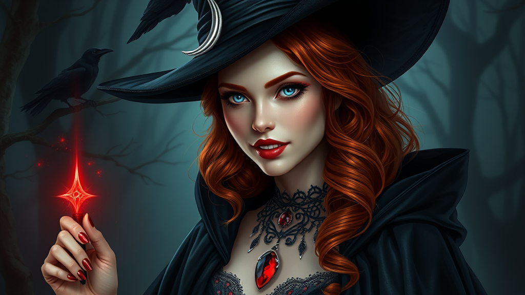 A digital fantasy artwork features a captivating witch with striking features. The subject is a woman with alabaster skin and fiery red hair cascading in soft waves. She wears an elegant black witch's hat adorned with a silver crescent moon and a dark, lace-trimmed cloak that billows around her. Her eyes are an intense, electric blue, and her smile reveals sharp, elongated fangs. In her right hand, she wields a wand that emanates a crimson, magical glow. Around her neck is an intricate black choker adorned with a deep red gemstone in the shape of a teardrop. The background depicts a shadowy, mist-laden forest with the silhouettes of ravens perched on gnarled branches, enhancing the mystical and eerie atmosphere. The color palette is dominated by dark hues with red highlights, accentuating the supernatural essence of the image.