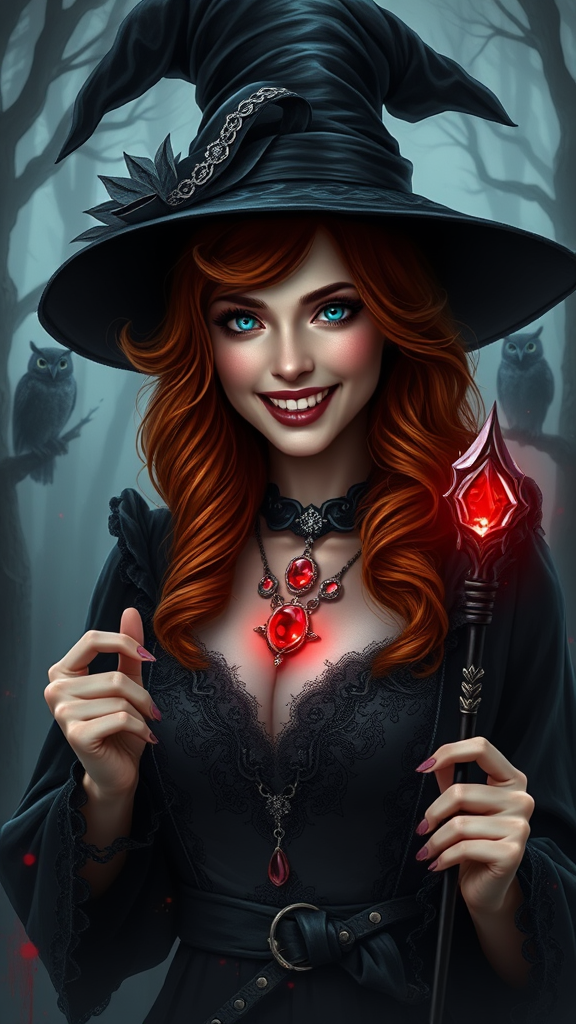 A digital fantasy artwork presents a captivating witch with distinctive features. The subject is a woman with porcelain skin and fiery red hair cascading in loose waves. She dons an elegant black witch's hat adorned with silver accents and a flowing velvet cloak with intricate lace trim. Her eyes are a brilliant, glowing turquoise, and she flashes a wide smile that reveals elegantly tapered fangs. In her right hand, she holds a wand shimmering with a crimson, magical aura. Around her neck is an ornate choker crafted from onyx, featuring a luminescent ruby gemstone at its center. The background features a shadowy, mist-laden forest with the silhouetted forms of owls perched in the trees, enhancing the mystical and eerie atmosphere. The color palette consists mainly of deep, moody hues with splashes of red, intensifying the supernatural ambiance of the scene.