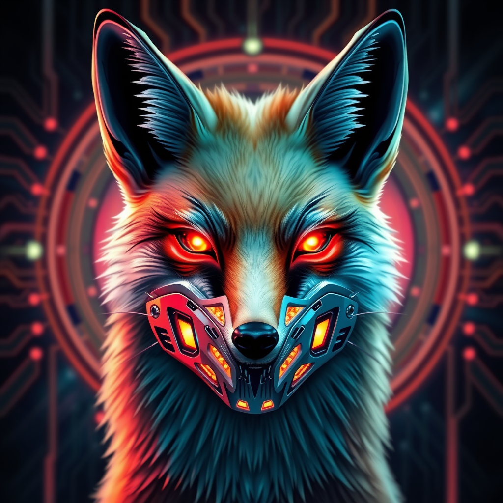 A digital fox with sleek, iridescent fur wears an intricately designed mask over its mouth, reflecting a fusion of technology and nature; its eyes glow with an enigmatic luminescence, surrounded by a backdrop of abstract circuits and neon hues.