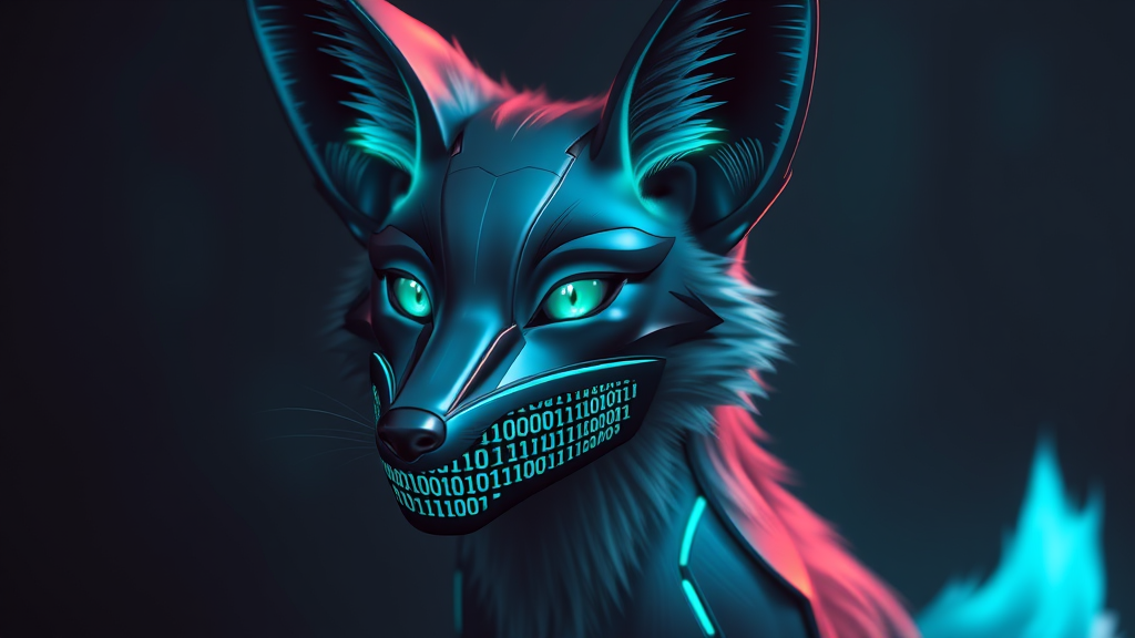 A digital fox with sleek, metallic fur and glowing emerald eyes, adorned in an intricately designed mask over its mouth, reflecting patterns of binary code. Subtle neon blue accents outline its ears and tail, casting an ethereal glow in the dimly lit, futuristic environment.