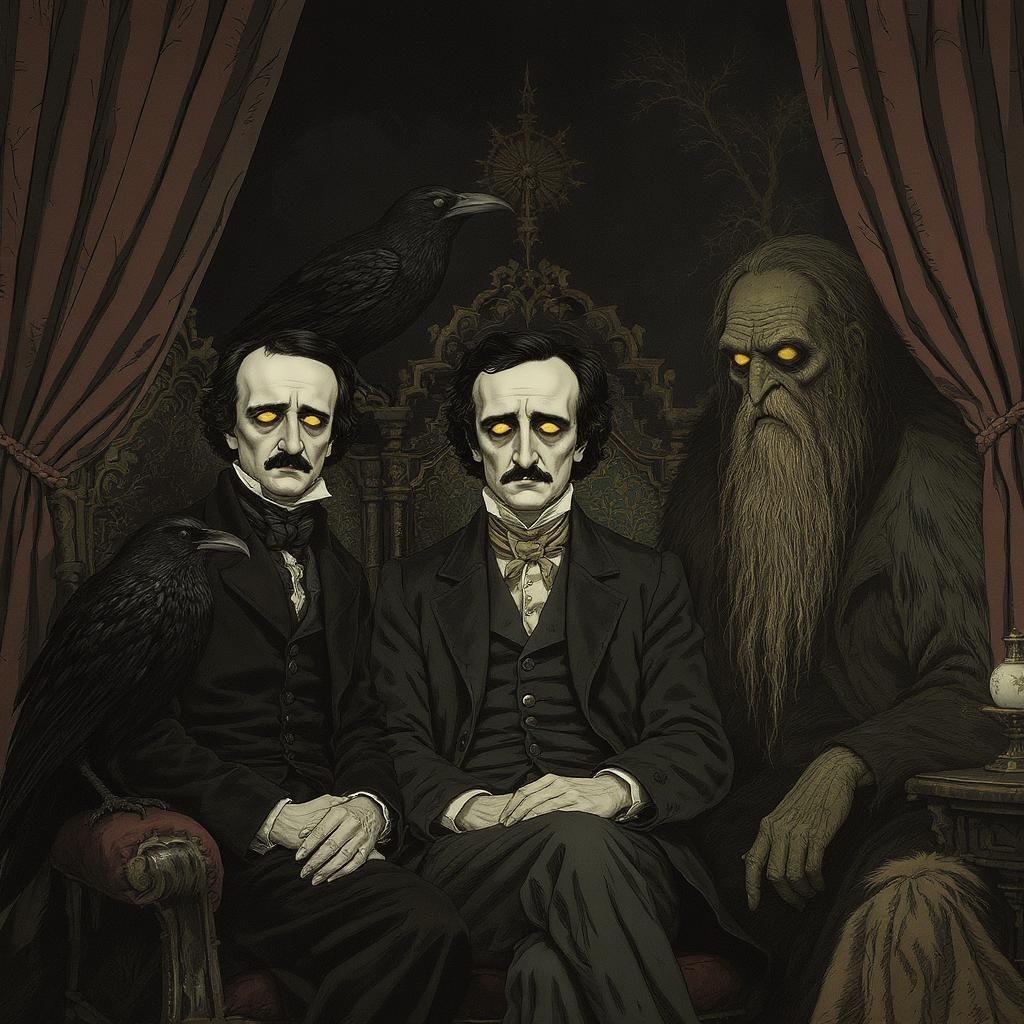 A digital illustration depicting Raven, Edgar Allan Poe, and H. P. Lovecraft seated in a dimly lit room, exuding a sense of brooding and introspection. The scene is characterized by highly detailed clothing and expressive facial features, inspired by the artistic styles of Edward Gorey, Tim Burton, and Mike Mignola. The color palette is subdued and muted, reinforcing the gothic atmosphere. Raven is perched nearby, adding an element of mystery. The composition captures a vivid interplay of shadows and light, enhancing the moody ambiance. The characters' eyes seem to hold untold stories, reflecting their complex imaginations and literary legacies.