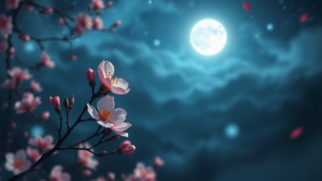 A digital illustration depicting the surreal and dreamlike scene of a plum blossom illuminated by moonlight, with a vast, cosmic background inspired by artists like George Lacom, James A. R. Izzy, and Marin. This artwork conveys an autumn night ambiance, reminiscent of Ji Sheng and Shen Shichong's luminous style, showcasing a blurred and ethereal depiction of a calm night. The painting merges elements of Amédée Ozenfant's fantastic illustration with an astral plane, cosmic realm aesthetic. The composition plays with light and shadow, creating a multi-layered vista featuring fractal waves. Influenced by the dynamic styles of Dan Mumford and Alex Gray, the piece embraces psychedelic surrealism through infinite waves and ripple structures, drawing inspiration from Cyril Rolando. The resulting image is a hypnotic blend of surreal dreamscape, optical illusion, and authentic ripple design, rendered in OC renderer - V6 style.