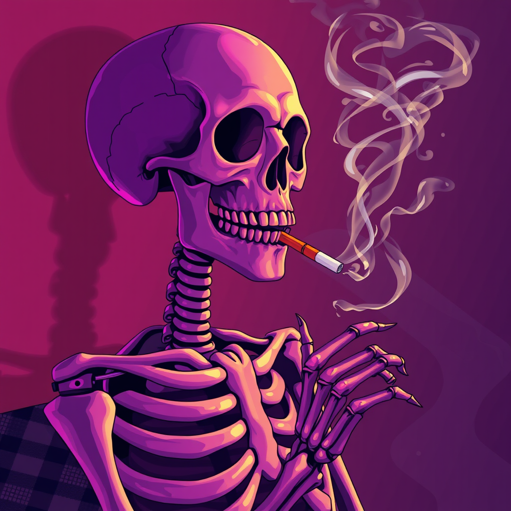 A digital illustration features a smoking skeleton set in the modern era, blending vibrant and earthy hues with dominant purples, pinks, and warm browns. The skeletal figure exudes an eerie yet captivating charm, smoke curling gracefully from the cigarette held in its bony fingers, contrasting with the intricate detail of its bones. Atmospheric lighting enhances the striking color palette, casting playful shadows and creating an aura that blurs the lines between the mundane and the macabre.