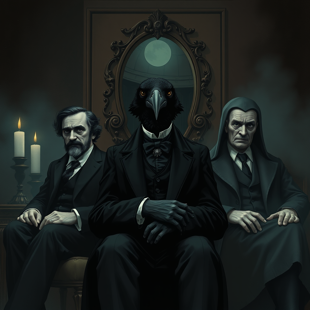 A digital illustration featuring a portrait of a raven alongside Edgar Allan Poe and H. P. Lovecraft seated in a dimly lit room, surrounded by an atmosphere of brooding introspection. The artwork embodies the styles of Edward Gorey, Tim Burton, and Mike Mignola, showcasing highly detailed clothing and expressive faces. The color palette remains subdued and muted to enhance the gothic ambiance, while the setting conveys a timeless, eerie charm.