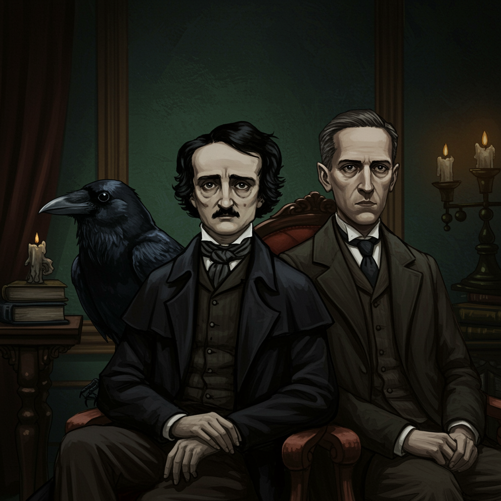 A digital illustration featuring a portrait of a raven alongside Edgar Allan Poe and H. P. Lovecraft seated in a dimly lit room, exuding a sense of brooding introspection. They are depicted in highly detailed clothing and expressive faces, surrounded by an atmosphere that resonates with the gothic style of Edward Gorey, Tim Burton, and Mike Mignola. The color palette is subdued and muted, enhancing the somber mood. The room’s shadowy corners and dim lighting add depth, while the characters’ distinct styles combine elements of gothic storytelling, with a focus on their shared literary legacy and mysterious allure.