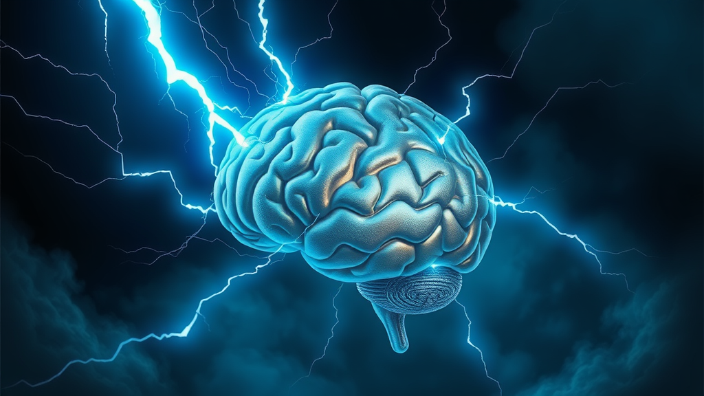 A digital illustration of a brain being struck by a neon blue bolt of lightning, transforming into a luminous orb of energy with a metallic sheen. Swirling streams of energy encircle the orb, casting a soft glow against a dark, mysterious environment. Faint shadows loom in the background, enhancing the mystical and otherworldly atmosphere. Intricate details and textures showcase the vibrant, fantastical nature of the scene, with the glowing orb radiating a sense of power and awe.