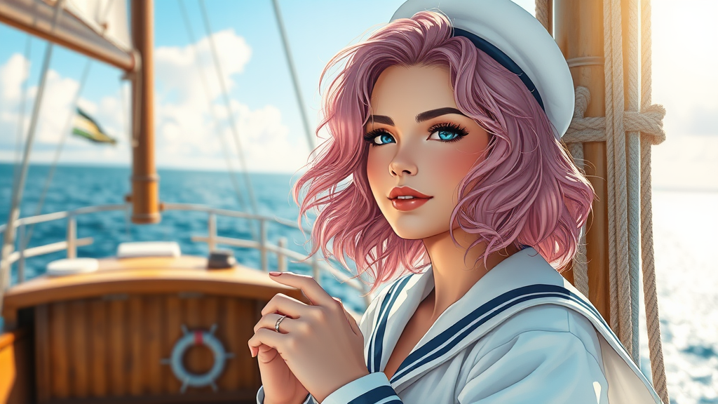 A digital illustration of a female sailor aboard a ship basking in the fresh seabreeze, featuring medium wavy pastel pink hair. The scene is set under a bright sun, with a volumetric atmosphere that enhances the vibrant and intricate details. Her face exudes beauty and serenity, complemented by elegantly rendered hands. The artwork is of the highest quality, with sharp focus and precise linework, capturing breathtaking detail in a cinematic style. The composition is stunningly high-resolution and evokes a sense of vivid realism as if crafted for an award-winning piece. The mood is lively, with an emphasis on the sailor's connection to the sea and wind.