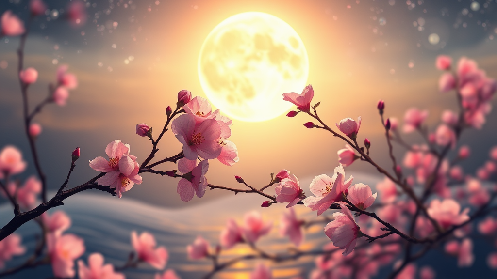 A digital illustration of a plum blossom set against the backdrop of a luminous moon, drawing inspiration from the serene compositions of artists like George Lacom and James A. R. Izzy. The scene captures a calm night infused with moonlight, echoing the dreamlike quality of Ji Sheng's autumn night and the ethereal essence of Shen Shichong's style. The painting blends the fantastic elements of Amédée Ozenfant, depicting a surreal dreamscape within a cosmic realm. It reflects light and shadow through infinite psychedelic waves, incorporating a multi-layered vista reminiscent of Dan Mumford's fractal thunder and Alex Gray's surrealist art. This psychedelic illustration features optical illusions and authentic ripple structures inspired by Cyril Rolando, crafting an infinite wave in a dream art style, rendered in the OC renderer - V6. The scene is a blurry, surreal blend of colors, capturing a tranquil and ethereal visual experience that maintains the core essence of this quintessential blend of artistic inspiration.