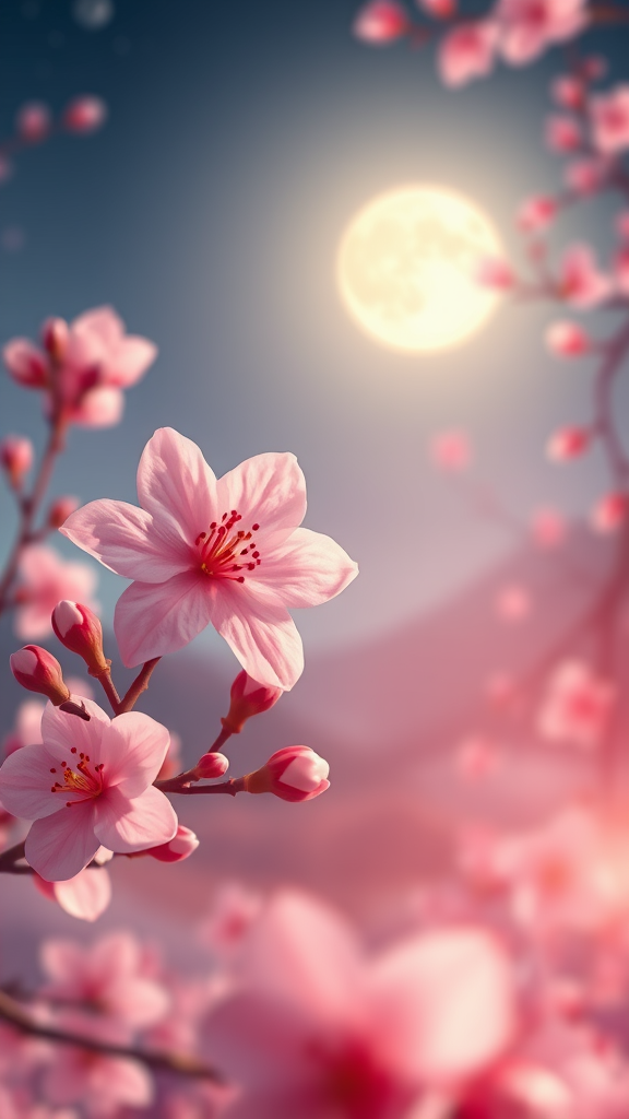 A digital illustration of a plum blossom with a luminous moon in the background, inspired by George Lacom and James A. R. Izzy. The scene captures the moonlight night essence, blending elements from Marin’s calm night and the serene aura of Ji Sheng’s autumn night. Echoing Shen Shichong's luminous style, the illustration presents a blurry and dreamlike landscape. Infused with Amédée Ozenfant’s fantastic elements, the piece unfolds in a surreal dreamscape on an astral and cosmic plane. The play of light and shadow creates multi-layered waves in the foreground and vista. The artwork channels the fractal thunder aesthetics of Dan Mumford and Alex Grey, combining psychedelic surrealism and dream art with optical illusion facets. Infinite psychedelic waves weave through the vibrant scene, inspired by Cyril Rolando, showcasing an authentic ripple structure throughout the artwork.