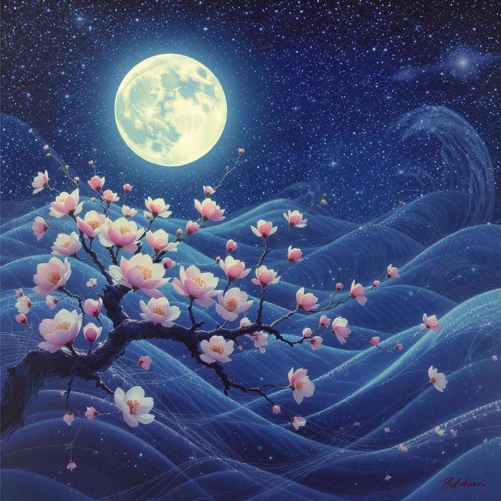 A digital illustration of a plum blossom with a moonlit background, drawing inspiration from George Lacom and James A. R. Izzy, capturing an ethereal night scene. The composition intertwines elements of moonlight and an autumn night, reflecting the serene influences of Marin and Shen Shichong. Ji Sheng's luminous style permeates the artwork with a soft, dreamy focus, creating a calm ambiance. This piece embodies the fantastical essence of Amédée Ozenfant, exploring an astral plane colored in surreal and ethereal hues. The cosmic realm unfolds in a surreal dreamscape, where light and shadow play amidst waves that echo Dan Mumford's multi-layered approach. Influenced by Dan Mumford and Alex Gray, the artwork delves into a psychedelic surrealist style, featuring infinite, vibrant waves and authentic ripple structures reminiscent of Cyril Rolando. This surreal dream art offers optical illusion elements, rendered with OC renderer - V6, where reality blurs with imagination in a vivid, dreamlike state.