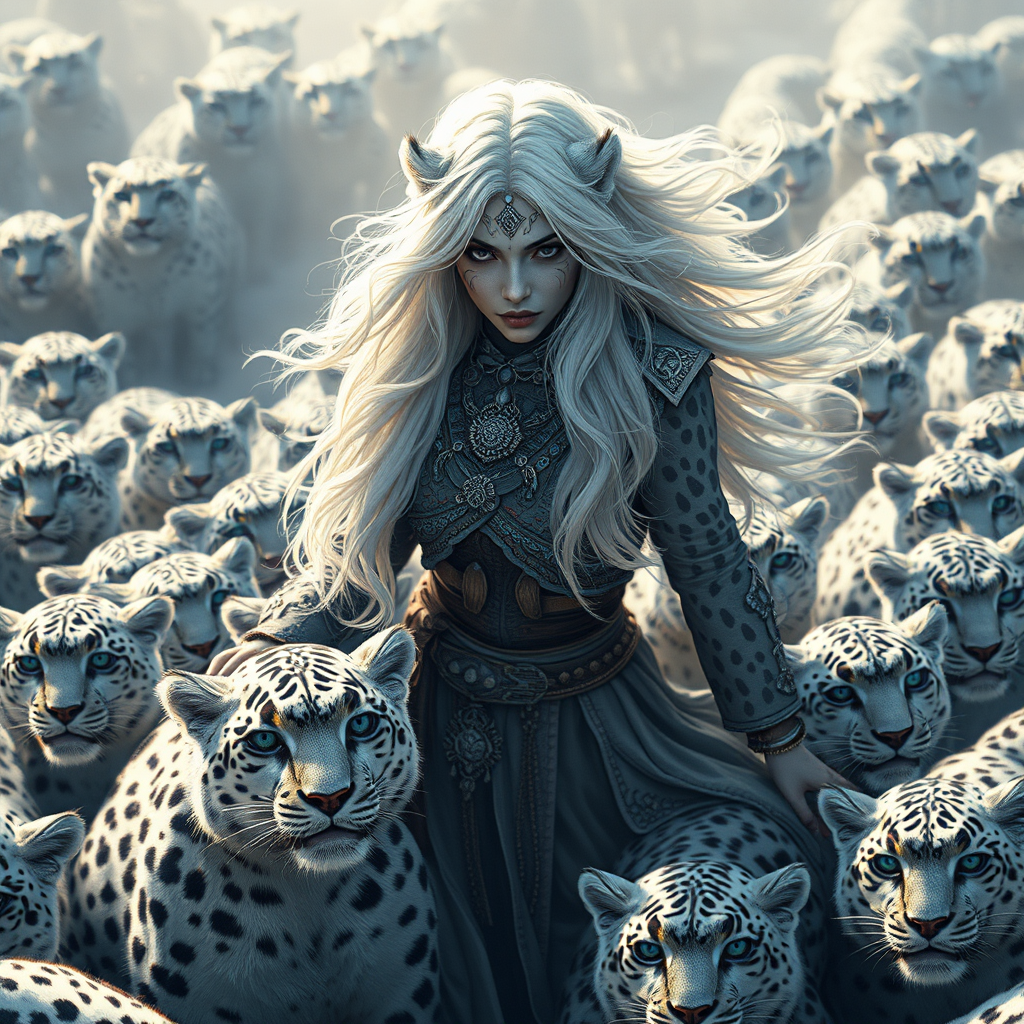 A digital illustration of a snow leopard goddess woman in a full body view, captured in a wide-angle shot. She strikes a dynamic pose with a tense expression on her face, her white hair flowing around her. She is surrounded by dozens of snow leopards in an intriguing and intricate composition. The scene is rendered in photorealistic detail, showcasing an 8k resolution masterpiece with a focus on capturing every nuance. The image is created in a wide-angle aspect ratio of 9:16, emphasizing a detailed and expansive masterpiece, while ensuring the goddess remains the focal point amidst the majestic leopards.