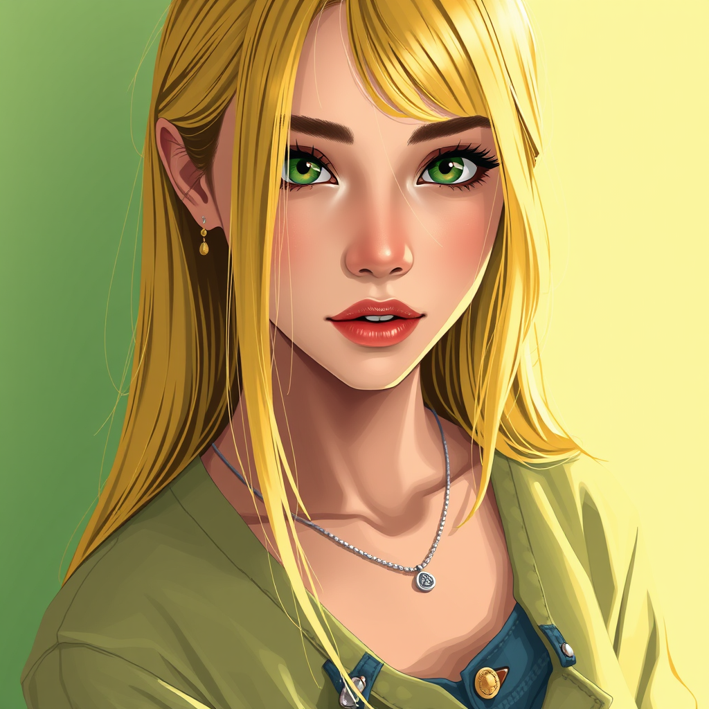 A digital illustration of a young woman, focusing on her upper body, reminiscent of popular art featured on Artstation. She has sunburst yellow long, straight hair and captivating dark emerald green eyes. The background is an almond green, complementing her dark banana yellow shirt and jeans, with a simple design. She appears to be around 20 years old, with a matured sense of style and a healthy figure. She wears subtle golden earrings and a silver necklace, adding elegance to her appearance. The artwork is rendered in 8k resolution, highlighting the beauty and intricate details of the composition.