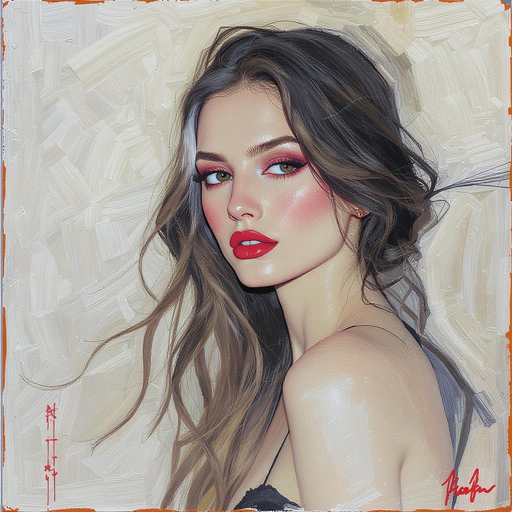 A digital oil painting of a fashion model with an elegant presence, featuring heavy, textured brushstrokes. The model, inspired by artists like Kaethe Butcher and Jeremy Mann, exudes calm confidence and subtle seduction. Her long hair flows gracefully around her, framing her perfectly expressive eyes. The composition embraces an expressionistic style, with an intricate focus on her features. While maintaining an artistic touch, the piece explores abstract elements, incorporating unusual angles, and playing with unconventional proportions. Subtle imperfections such as softly blurred details and slight distortions blend into the artwork, giving it a unique character. Despite the stylistic choices, the model remains captivating, surrounded by hints of surrealism and artistic interpretation.