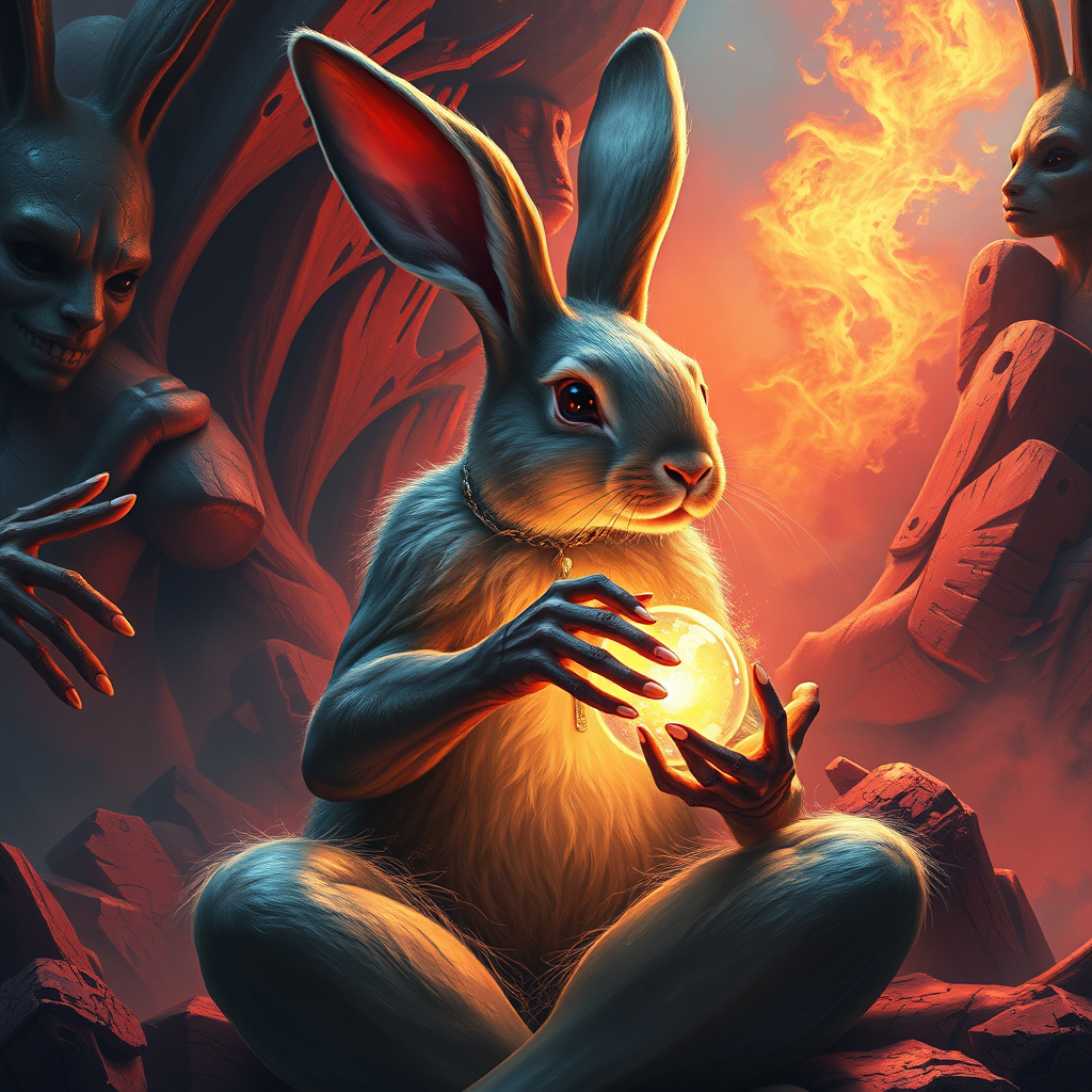 A digital painting captures a mystical rabbit clutching a radiant orb, set in a vibrant cyberpunk world. The style draws heavily from Tomasz Alen Kopera, blending fantasy art with elements of textured skeleton warriors. Inspired by Beeple and "The Demon Seated," this scene brims with shamanistic and witchy motifs, reflecting an official fanart style seen on Behance. The image combines 4k detail reminiscent of photo-realistic ghostly figures like Anubis with the warmth of a techno-shaman lady, hinting at fantasy illustration elements. Bursting with vivid colors, the artwork is crafted in ultra-high definition, resembling a 16k resolution HDR10 spectacle. Despite its complex composition, there's an inherent attention to absurd and surreal details, such as replicated forms and mutated elements, leading to a captivating blend of characteristics like long necks and extra fingers. Yet, the image maintains clarity, free from common digital art distortions like blur or jpeg artifacts, and avoids features like watermarks or text overlays that could distract from its essence.