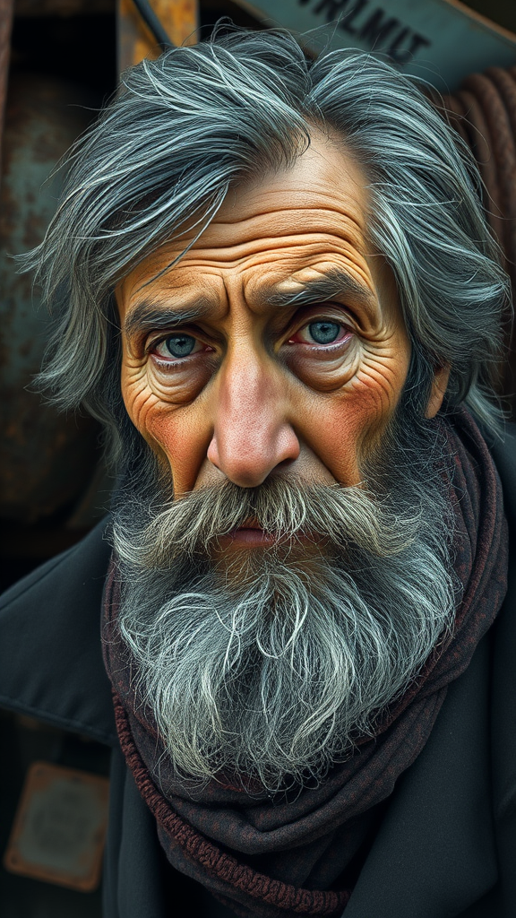 A digital painting capturing an old man with a wispy beard streaked with dark grays, set against a backdrop reminiscent of photorealistic urban scenes. The artwork incorporates elements of algeapunk with vibrant colors woven into rusty debris surrounding the figure. His expressive face is rendered with a soft-focus technique, producing a portrait that feels both intimate and striking, blending urban grit with an unexpected vibrancy, characteristic of flickr-style portraits. The image maintains ultra-high definition detail, adding depth and life to the character and his rugged environment.