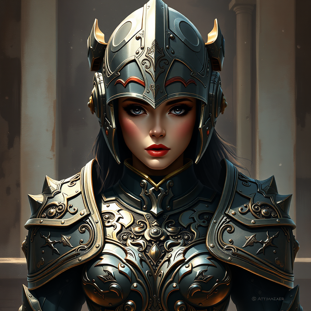 A digital painting capturing the elegance of the most beautiful woman in the world standing on a balcony. She is a powerful Sister of Battle in ornate, intricately detailed armor inspired by Warhammer 40k. Her symmetrical face is framed by dark eyebrows, mascara, and makeup, with reflective eyes drawing you in. The setting is a backdrop of ruined marble walls, dust particles in the air, and bullet holes, all brought to life with dramatic chiaroscuro lighting. The style is a majestic fusion of impressionism, reminiscent of artists like Waterhouse and inspired by Studio Ghibli's atmospheric charm. Trending on ArtStation and CGSociety, this piece displays high detail and sophistication with hints of face paint beneath a steel helmet, capturing an ethereal warrior spirit.