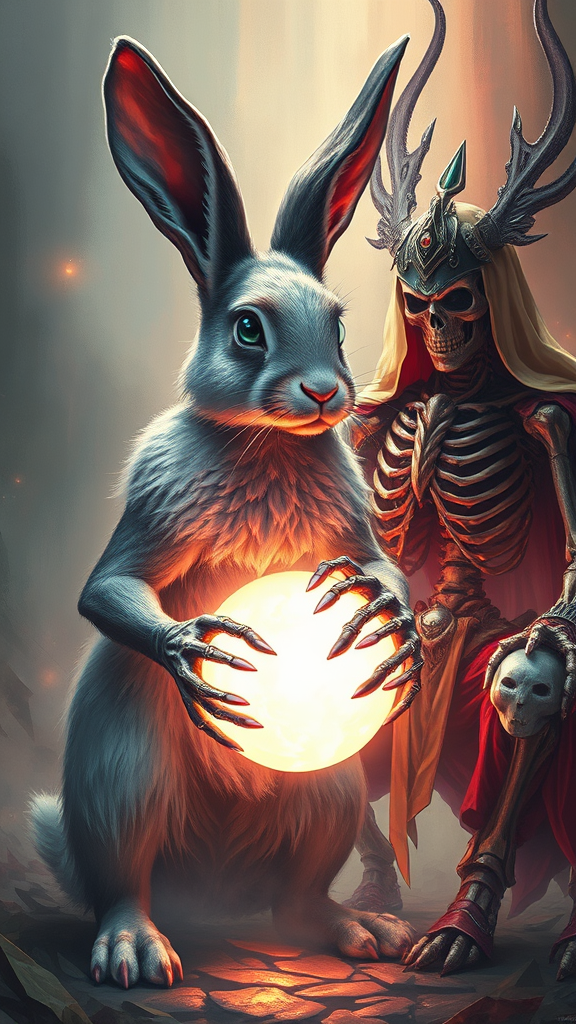 A digital painting depicting a cyberpunk-inspired rabbit gripping a luminescent orb, influenced by the fantasy art style of Tomasz Alen Kopera. The rabbit stands alongside a detailed, textured skeleton warrior, evoking the style of "The Demon Seated" with a complex, artistic flair reminiscent of Beeple's work. Enveloped in a mystical aura, a techno-shaman lady adds a layer of fantasy illustration, characterized by vivid, vibrant colors in ultra-high definition. The scene is set in an absurdly detailed resolution, aiming for an immersive 16k HDR10 experience. The artwork exudes a sense of wonder, subtly weaving elements from a ghostly Anubis and a shaman witch into a cohesive narrative, presenting an enchanting, futuristic tableau. The characters remain proportionate and distinct, avoiding disfigurement or mutation in a seamless portrayal free from visual distractions such as watermarks or artifacts.