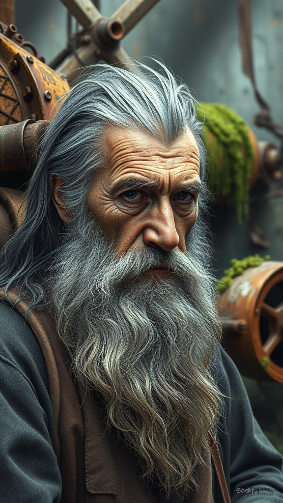 A digital painting depicting an elderly man with a long, flowing beard streaked with dark grays, set against a backdrop of urban decay. The scene is rendered in a photorealistic style, capturing the essence of a vibrant, bustling city slowly succumbing to the rust and debris of time. The manβs wise, weathered face reflects serenity amidst chaos, his eyes a deep well of stories. Around him, remnants of a once-thriving algeapunk culture peek through β rusted machinery overgrown with soft tendrils of vibrant green algae. The image composition plays with depth of field, utilizing soft-focus to emphasize the soulful expression of the man, while the surrounding urban elements blend into a textured, almost painterly bokeh. The color palette is an interplay of warm rusts and cool urban grays, capturing the collision of man and machine, past and present, with a hint of vivid life persevering through time.