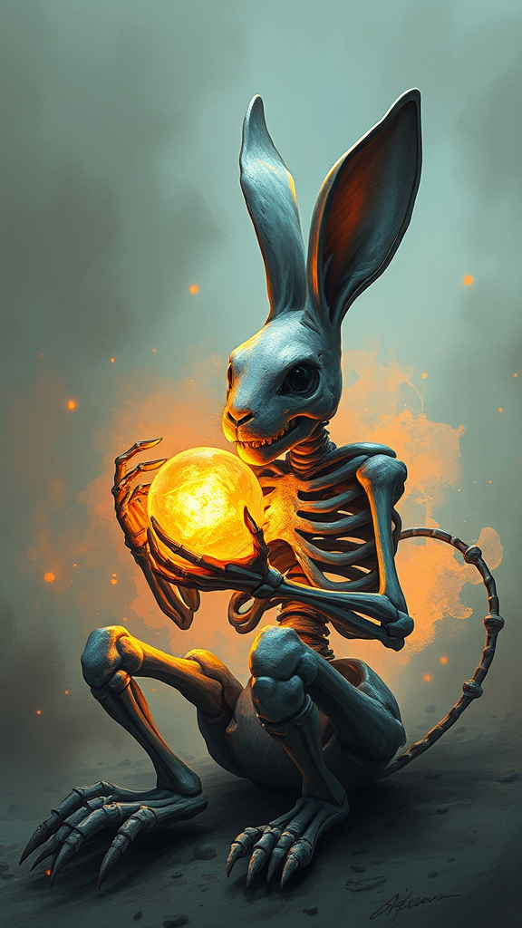 A digital painting featuring a rabbit delicately holding a radiant orb, blending elements of cyberpunk and fantasy art. Influenced by Tomasz Alen Kopera, Beeple, and the whimsical style of shaman witchcraft, this piece displays a skeleton warrior with intricate, textured details, reminiscent of "The Demon Seated." The scene unfolds with vivid colors, utilizing state-of-the-art UHD, HDR10, and 16k resolution for an immersive experience. Inspired by the ghostly presence of Anubis, and a techno-shaman aesthetic, the artwork combines hints of absurdity and surrealism. A model akin to Lyriel v1.5 introduces a fresh take on transformation, exploring the boundary between mutation and dynamic form, while avoiding standard distortions like extra appendages or misplaced features. The painting remains free of distracting elements such as watermarks, logos, or text, ensuring a clear and focused composition that captures the essence of a fantastical, futuristic realm.