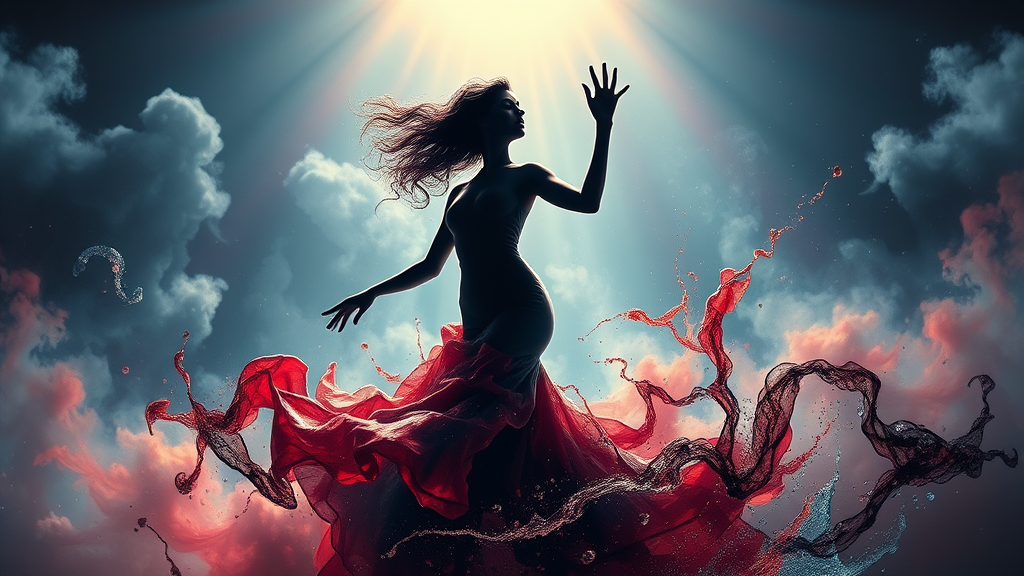 A digital painting inspired by Alberto Seveso's art featuring a dancing silhouette of an elegant woman, enveloped in swirling clouds of ink and splashes of water. The scene is illuminated by god rays and cinematic lighting, showcasing her curvy form in intricate detail. Rendered in 8k resolution with volumetric lighting and complementary synthwave colors, this hyper-realistic artwork displays the stunning contrast of flame-like elements against a serene background. Mutated and distorted features are subtly integrated, adding an eerie yet captivating aspect to her form, with limbs floating in an ethereal dance. The use of black and white hands adds a touch of abstract surrealism, while maintaining a slight sense of mystery with blurred and obscured elements. The overall composition is vivid yet slightly surreal, creating a dreamlike atmosphere.
