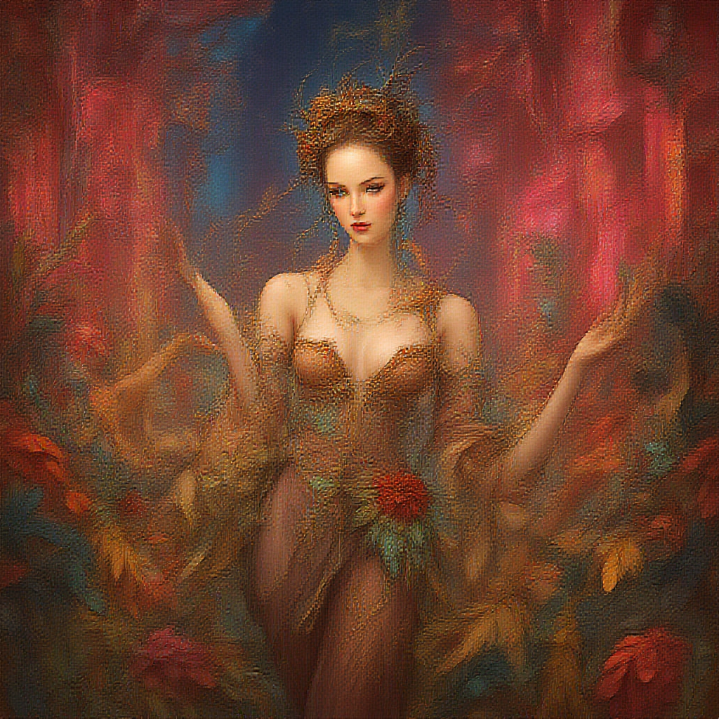 A digital painting inspired by the paper craft style featuring a voluptuous concubine adorned in feathers and flowers. The artwork blends influences from Ernst Haeckel and Maria Sibylla Merian, with a touch of Tristan Eaton’s vibrant colors and Victo Ngai’s intricate detailing. The scene is alive with the aesthetic of neon lights, reminiscent of Hajime Sorayama's sci-fi allure, Greg Tocchini's fluid lines, and Virgil Finlay’s ethereal compositions. Infused with the unique styles of Artgerm, Rhads, and Ross Draws, the image embodies a futuristic elegance. The character displays a detailed face, a graceful long neck, and expressive hands amidst an environment enriched with 8k UHD detail and HDR lighting. The artistry reflects the refined touches of Ilya Kuvshinov, set against a background where every element complements the surreal beauty of the main figure, avoiding any low-resolution or distracting elements like watermarks or text.
