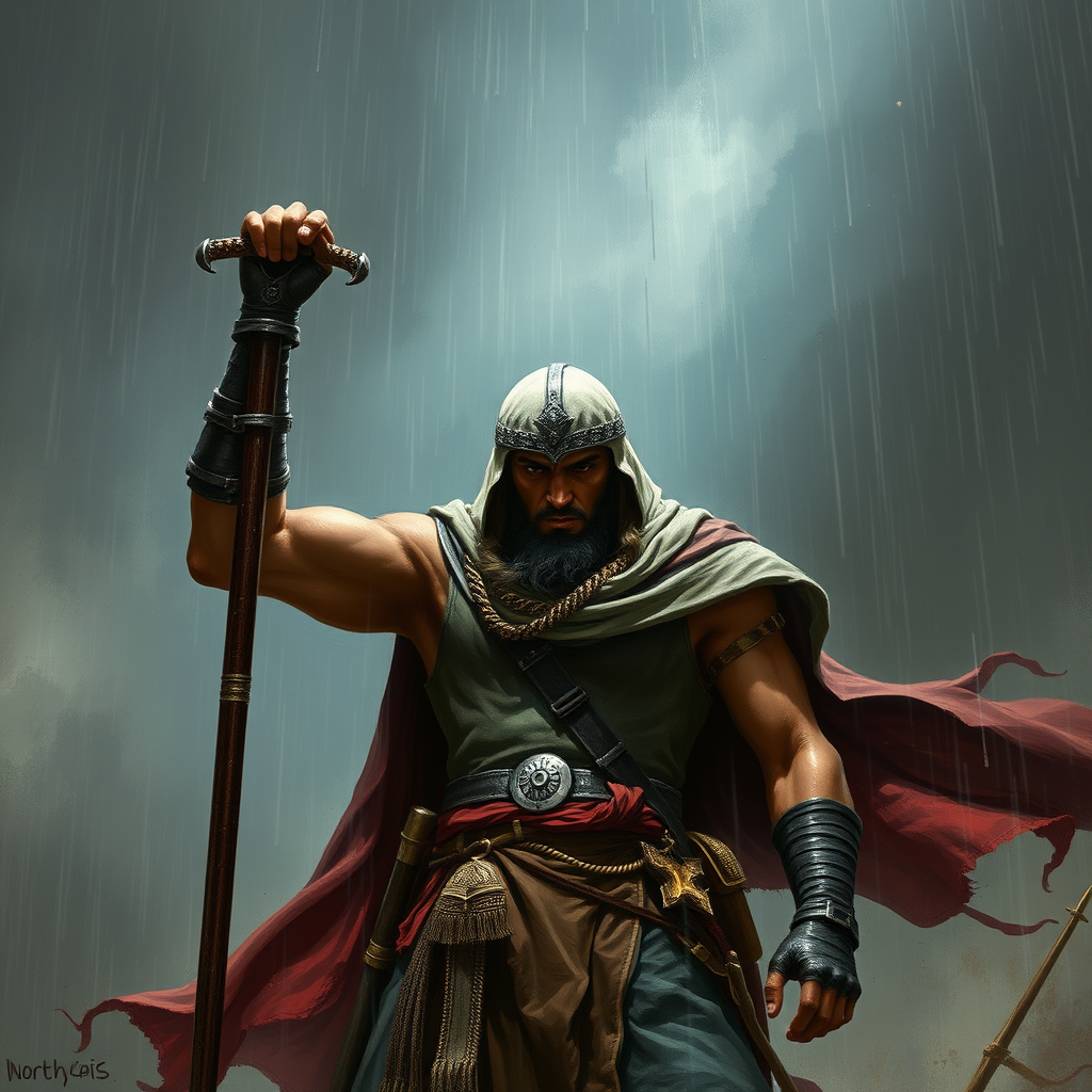 A digital painting of a fierce Arabian warrior standing resolute in the rain, exuding a sense of epic and emotional depth, inspired by the artistic styles of Martin Grip, Gustaf Ekelund, Jakub Rozalski, Bernie Wrightson, and Frank Frazetta. The composition is somber yet powerful, capturing the raw intensity and nobility of the warrior, his traditional attire and weaponry contrasting against the dramatic, stormy backdrop, evoking a sense of timelessness and mythic grandeur.