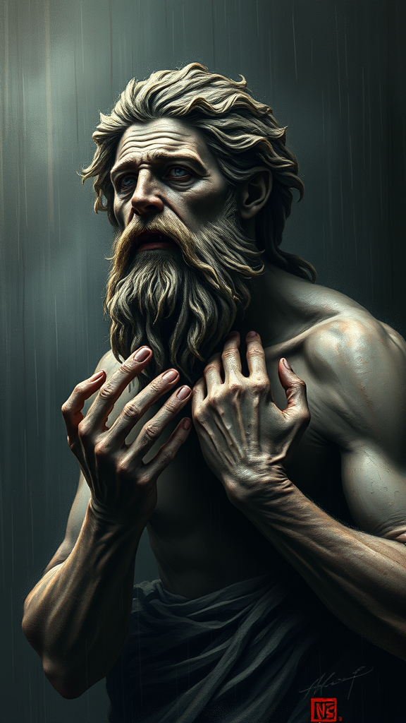 A digital painting of a Greek god in a desperate state, set against a dark, rainy background. The portrait uses muted colors and features a brutal, epic composition with an expressionistic style that conveys deep emotion. It leaves an unforgettable, haunting impression on the viewer’s psyche. The painting is intricate, yet intentionally characterized by a distorted quality with elements such as low resolution, pixelation, and visual noise. The god's features are disfigured, with poor anatomy and distorted proportions, including extra limbs and a long neck. His expression is pained, with poorly rendered hands and faces creating a morbid aesthetic. The portrait includes elements like a signature, watermark, and signs of digital alteration, making it look intentionally unfinished and degraded.