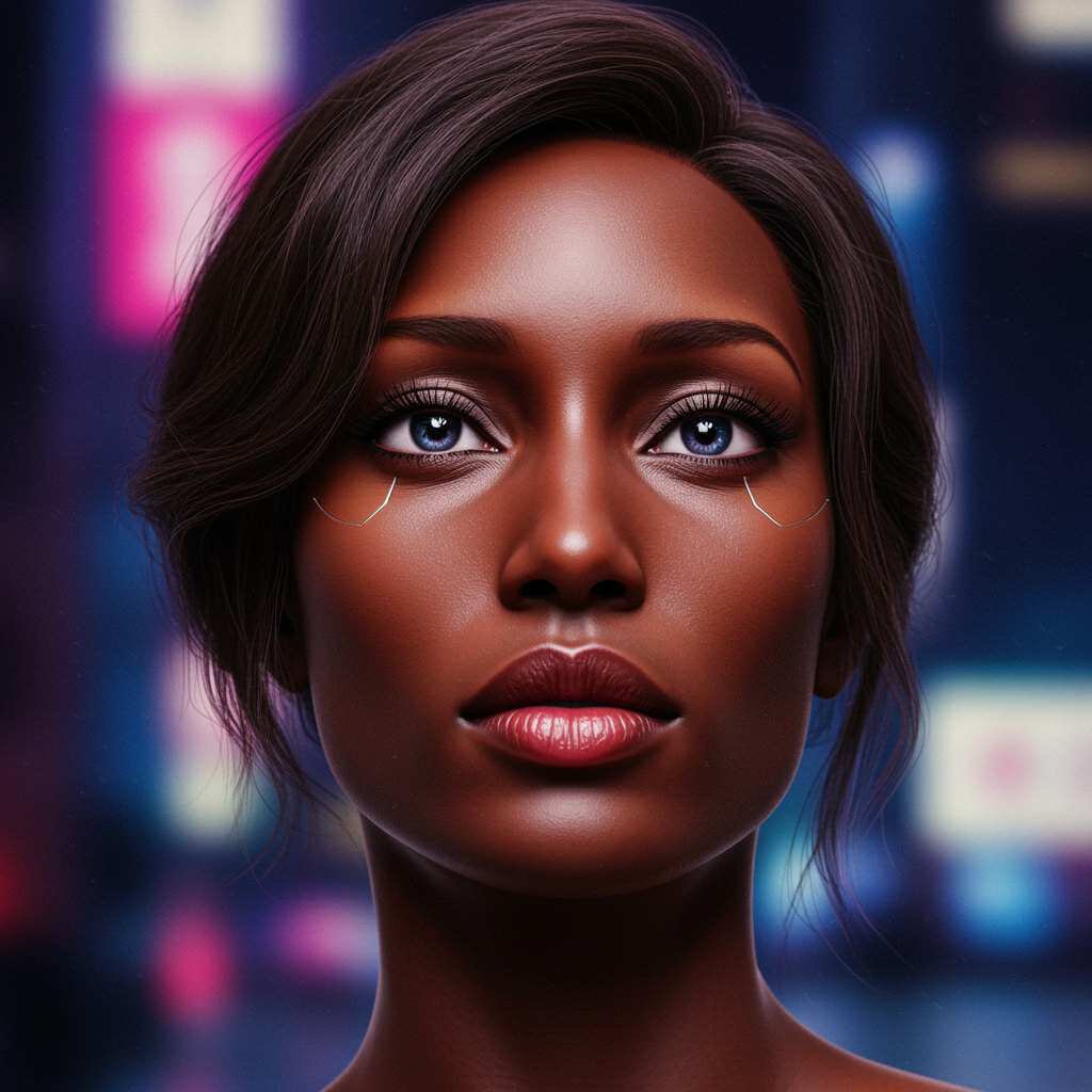 A digital painting of a model inspired by Jasmine Tookes as an anime character, rendered in high resolution HDR with hyper-detailed sharp focus reminiscent of works trending on ArtStation and DeviantArt, with influences from artists like Yasutomo Oka, Jovana Rikalo, Audrey Kawasaki, Josephine Wall, and Thomas Kinkade. Featuring an exquisitely detailed woman with mesmerizing, highly detailed eyes and symmetrical, deep black pupils. Her smooth, perfect face showcases perfect lips and a feminine, proportioned body. The expression is a relaxed, slightly submissive glare with an iridescent quality. Real hair movement and realistic lighting and shadow elevate the masterpiece. The composition is ultra-quality, with insane detail reminiscent of octane render technology. The character's pose is dreamlike, akin to an award-winning photograph, and set against a cyberpunk 2077, Blade Runner, Fifth Element-inspired backdrop. She appears as a 50-year-old with hair elegantly styled up, exuding a mature allure with deep red lips and a smirk. Enhanced nasolabial folds add to her mature charm as she looks upwards, embodying a highly detailed face with subtle cyberpunk elements.
