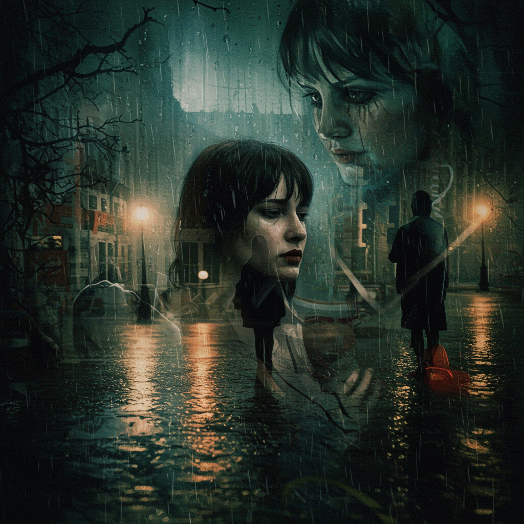 A digital painting of a nostalgic, rainy scene that evokes memories of lost love. The composition is dramatic and emotionally profound, with muted colors creating a haunting impression on the psyche. The intricate artwork bears a resemblance to the styles of Milo Manara and Russ Mills, featuring a profound atmosphere. Despite subtle imperfections like jpeg artifacts and slightly distorted proportions, the piece's evocative nature remains untouched, capturing a melancholic yet unforgettable moment. Elements of human form and expression blend into the background, abstract and dreamlike, enhancing the emotional depth of the scene.