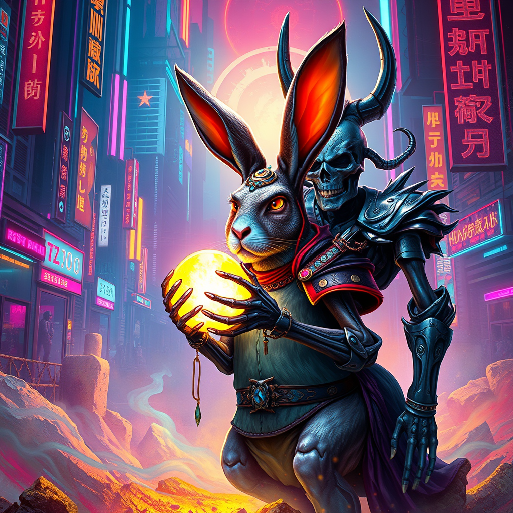 A digital painting of a rabbit holding a glowing orb, set in a cyberpunk world with vibrant neon lights and futuristic cityscape. This fantasy art piece is inspired by the intricate and textured details akin to Tomasz Alen Kopera, featuring a skeleton warrior adorned in elaborate armor. The scene captures the aesthetic of "The Demon Seated," combined with elements of Beeple's dynamic style and shamanistic influences. The rabbit, a surreal figure with a wise presence, stands amidst a ghostly Anubis-like guardian. The backdrop is enhanced with vivid colors and ultra-high-definition details, in 16k resolution with HDR10 quality. The atmosphere exudes a wholesome techno-shamanic vibe, rich in fantasy with a touch of absurdity. The artwork portrays an otherworldly, enchanting narrative without any visual distortions or artifacts, focusing purely on the stunning cyber-fantasy illustration.