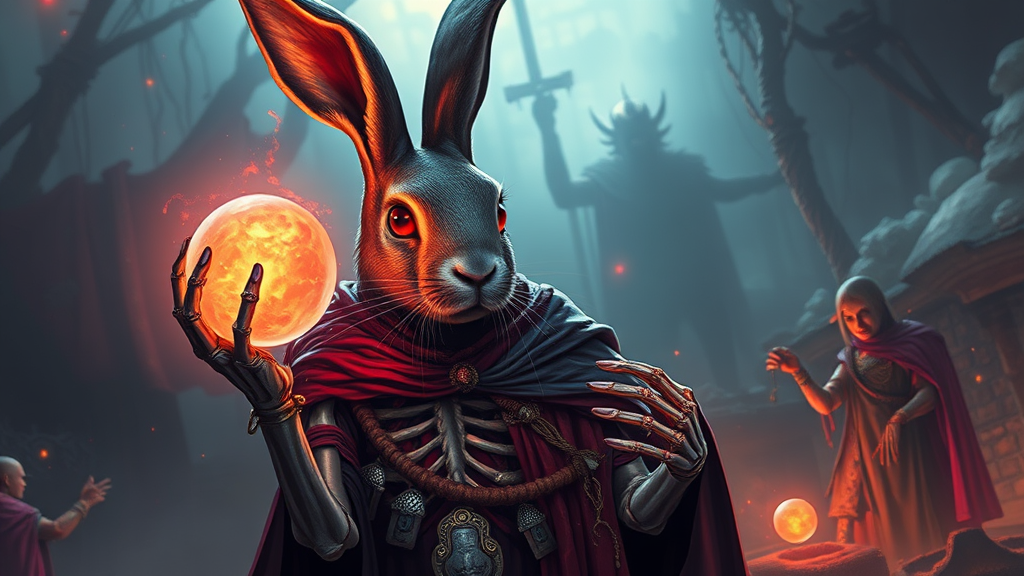 A digital painting of a rabbit holding a glowing orb, cyberpunk art style inspired by Tomasz Alen Kopera, featuring elements of fantasy with a textured, detailed skeleton warrior theme. The scene is reminiscent of Beeple's artwork, blending shaman witch aesthetics with vibrant, vivid colors. The composition includes the ghostly aura of Anubis, presenting a wholesome techno-shaman lady in a fantasy illustration set in UHD, HDR10, and 16k resolution. The art captures the absurd resolution and meticulous detail of Model Lyriel v1.5, avoiding common pitfalls like disfigured or mutated features, low resolution, or unnecessary visual clutter like watermarks or logos, instead focusing on a cohesive and immersive visual narrative.