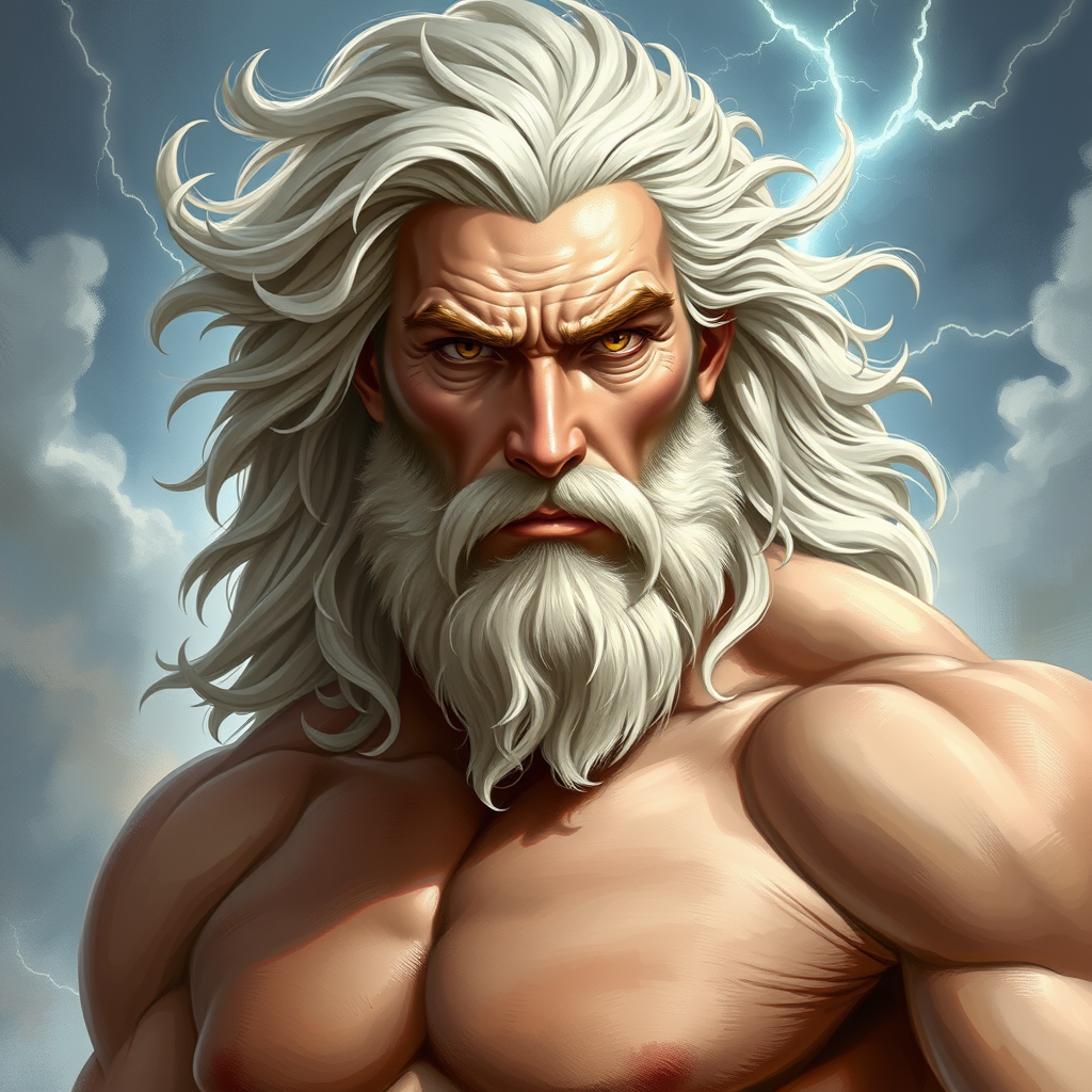 A digital painting of a regal and powerful Zeus, the Greek god of thunder, depicted with rugged masculinity and divine presence. He has flowing white hair and an intense, mature gaze that conveys timeless wisdom. His handsome face is complemented by a muscular upper body, adorned with a naturally hairy torso. The portrait emanates fantasy elements with intricate details and elegant composition, capturing the essence of a celestial deity. Inspired by the artistic styles of Gaston Bussiere and Alphonse Mucha, the piece showcases a harmonious blend of smooth and sharp focus, resulting in a highly detailed concept art illustration. The setting is ethereal, with swirling clouds and subtle lightning motifs that emphasize his thunderous dominion.