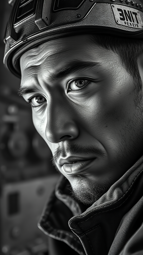 A digital painting of a strikingly beautiful artwork featuring a man in a lustrous, industrial mechanic setting situated in an extraordinary location. He appears as a rugged worker facing harsh conditions, captured in an action shot. His features are meticulously detailed, from skin pores to intricately rendered irises, set in very dark lighting with heavy shadows. The artwork showcases smooth, sharp focus with a full-body 8k unity render, inspired by the styles of Artgerm, WLOP, and Ilya Kuvshinov. The scene is in black and white, highlighting intricate facial details with an Asian influence. Rendered in octane with artstation-level concept art quality, the composition strikes a balance between soft textures and defined structure, offering a close-up yet three-dimensional depth. Elements of denim clothing add a layer of realism amidst the fantastic environment. The overall piece avoids being abstract or unfocused, ensuring coherence and clarity through vibrant artistic expression.