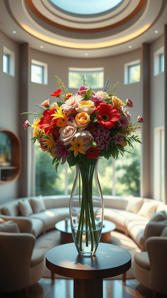 A digital painting of a vibrant bouquet of flowers elegantly arranged in a stylish vase as a focal point, set against the backdrop of a contemporary interior featuring a dreamy sunken living room conversation pit. The scene is illuminated by bright, soft diffused light streaming through small windows that offer glimpses of a lush garden outside. The high ceiling adds a sense of grandeur, while intricate details and depth of field enhance the composition. The artwork is highly detailed, evoking a sense of a harmonious masterpiece. Inspired by the styles of Artgerm, Greg Rutkowski, and Alphonse Mucha, this concept art piece stands out with its captivating elements designed to trend on Artstation. Presented in HDR 4K and 8K, the image invites viewers to explore every nuance of its richly detailed environment.