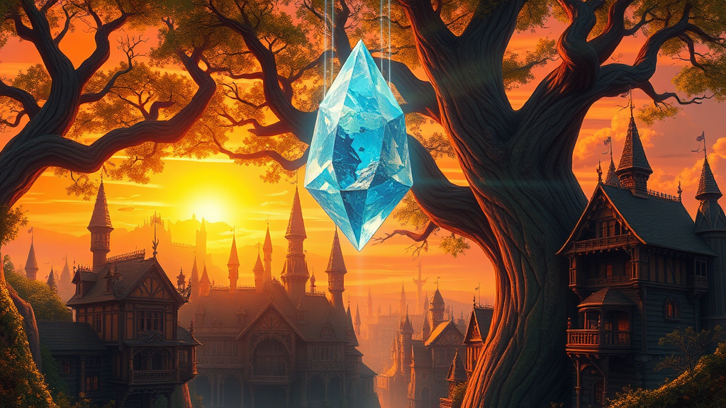A digital painting of a vibrant sunset casting a golden glow over a fantastical city entwined with towering trees, where the wooden structures exhibit an enchanting blend of medieval and fantasy architecture. Suspended above the city, an enormous luminescent crystal floats, casting radiant beams of light that dance through the branches and illuminate the woodland and the cityscape. The scene is depicted with a warm, inviting color palette, capturing a sense of magical wonder and timelessness in a panoramic 16:9 aspect ratio.