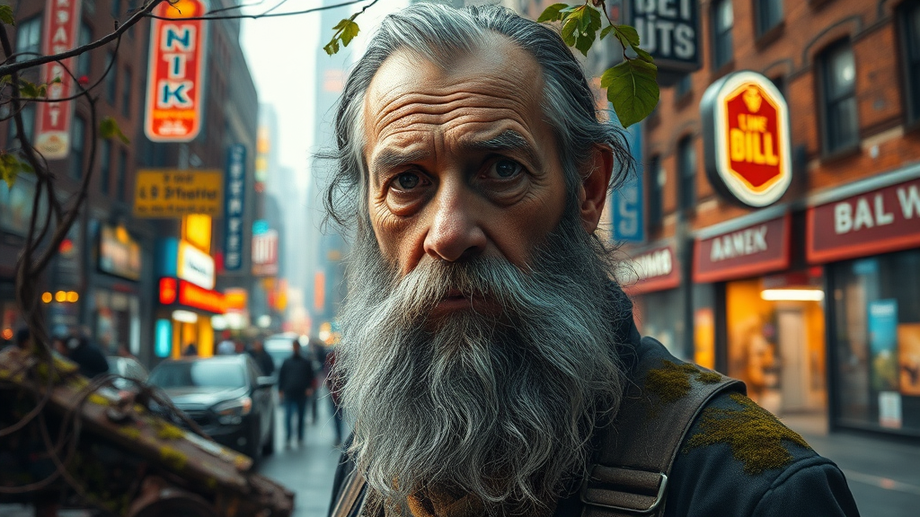 A digital painting of an elderly man with a long beard, streaked with dark grays and hints of silver, set against a backdrop of a photorealistic urban landscape. The scene is infused with elements of algeapunk, featuring sprawling vines and moss-covered surfaces amidst rusty debris and industrial remnants. The bustling city is depicted in vibrant detail, with bright neon signs and weathered brick buildings providing a stark contrast to the natural overgrowth. His portrait is captured in a soft-focus style, adding a sense of timelessness and depth, reminiscent of classic flickr portraits. His eyes, sharp and wise, convey stories of the city, set against the blurred backdrop of bustling streets and soft, ambient lighting.