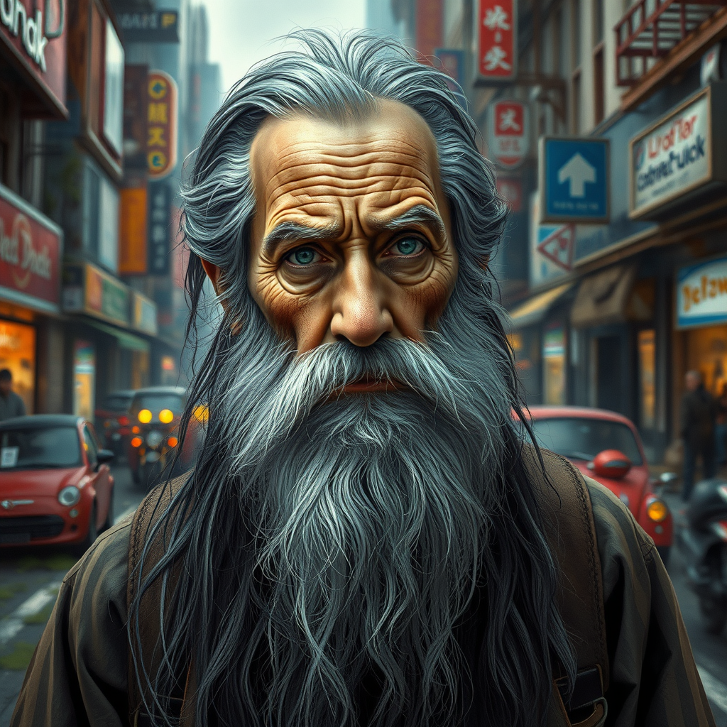 A digital painting of an elderly man with a long, flowing beard interwoven with streaks of dark gray, set against a backdrop of a bustling urban scene reminiscent of photorealistic cityscapes. The environment is algeapunk-inspired, with rusty debris and moss-covered elements blending seamlessly into the vibrant, lively portrait. The man's face is depicted in soft focus, capturing a sense of wisdom and serenity amidst the chaos of the city. His eyes reflect the flickering movements of people and vehicles around him, adding depth and life to the scene. The image boasts ultra-high-definition clarity, bringing out intricate details in the textures and colors of both the man and his surroundings.