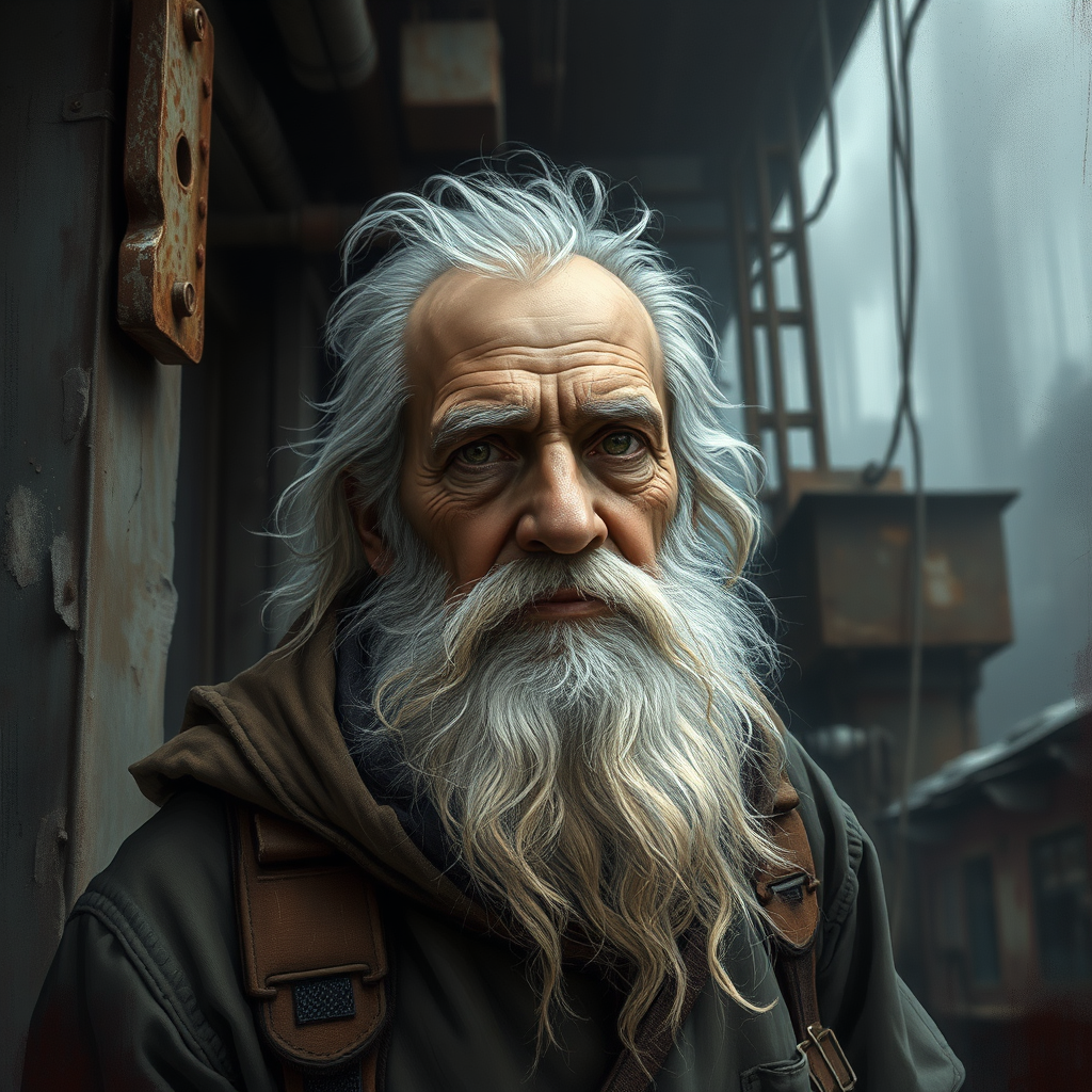 a digital painting of an elderly man with a long white beard, weathered and wise, set against a backdrop of urban decay with dark gray tones, photorealistic style capturing the gritty essence of city life, enhanced with algeapunk elements and rusty debris, vibrant yet muted colors highlighting character details, reminiscent of soft-focus portraits found on flickr, slight emphasis on the texture of the man's skin and clothing as they blend harmoniously with a backdrop of worn-down industrial structures.