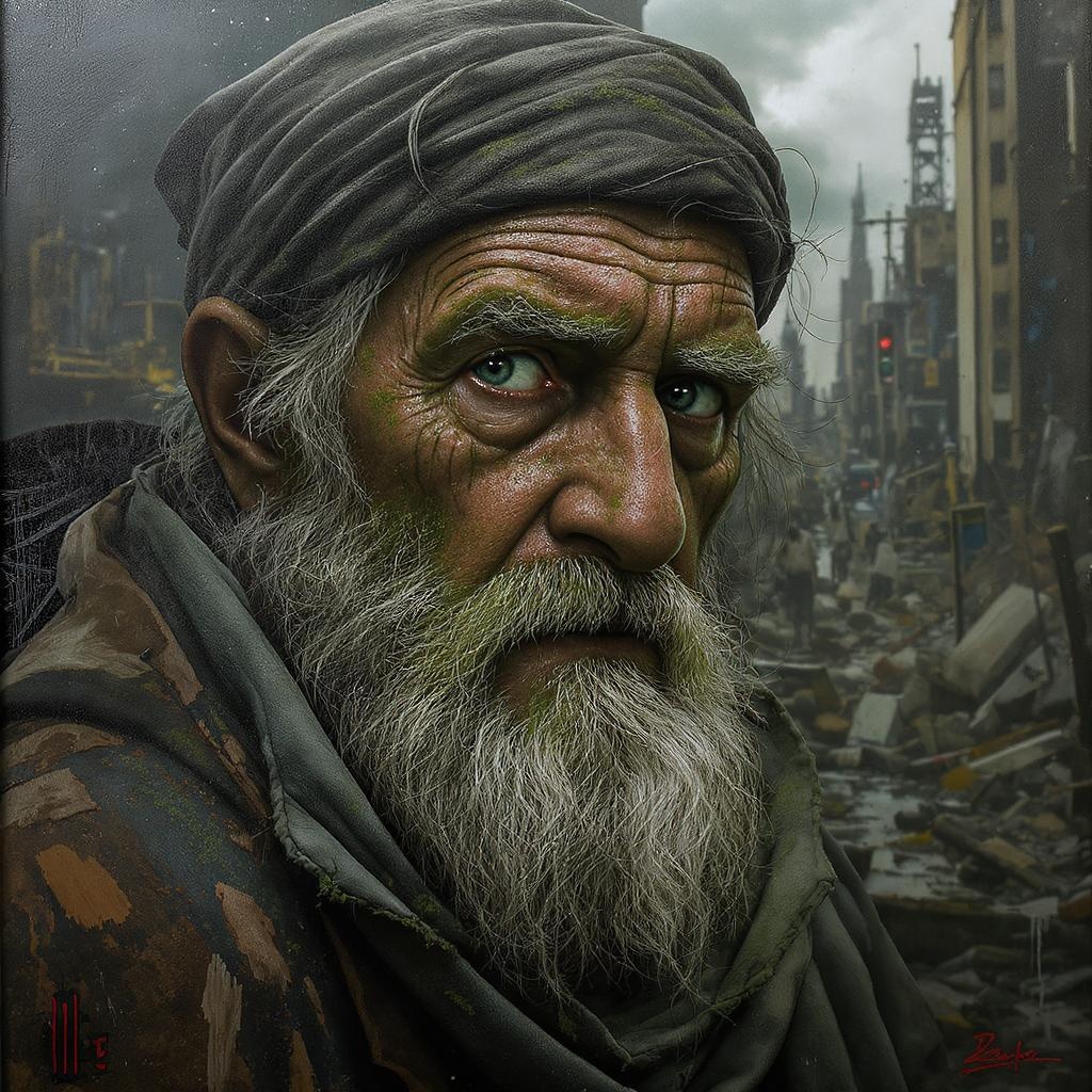 A digital painting of an elderly man with a weathered beard, streaked with dark gray hues, set against a backdrop of a photorealistic urban landscape. The scene merges elements of algeapunk, with patches of vibrant green algae intertwining among rusty debris. The man's face is a vivid portrait, eyes full of stories, blending seamlessly with the bustling urban environment. The image captures the essence of a Flickr-inspired, soft-focus portrait while maintaining ultra-high-definition clarity. The man's expression suggests wisdom and resilience, surrounded by a world in transition.