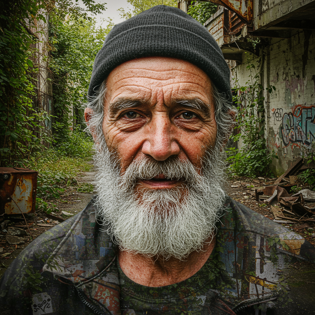 A digital painting of an elderly man with a weathered beard, set against a backdrop of urban decay, blending photorealistic detail with algeapunk elements, showing rusty debris intertwined with nature. His face, vivid and expressive, contrasts with the vibrant urban scene behind him—a tapestry of graffiti and overgrown greenery. The soft-focus adds a dreamlike, nostalgic quality, reminiscent of portraits found on Flickr. The man's eyes, deep and soulful, capture the wisdom of years, while the subtle play of light and shadow infuses the portrait with warmth and resilience.