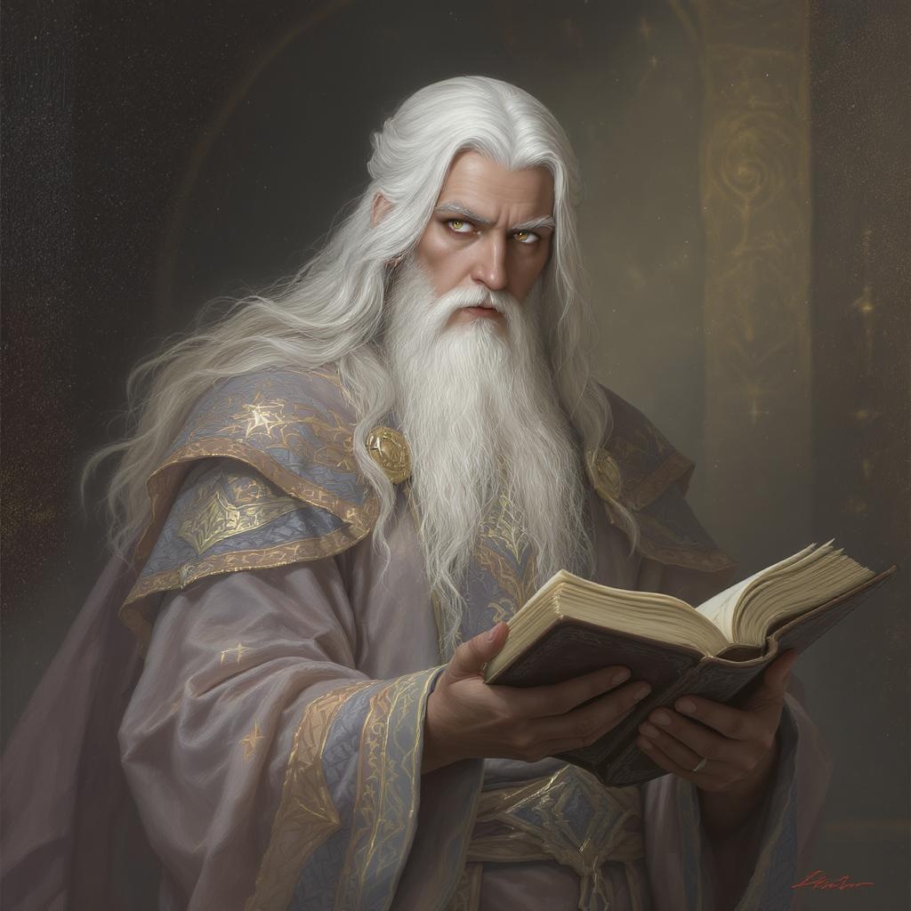 "A digital painting of an enigmatic wizard, featuring flowing white hair with hints of silver and grey, exuding a sense of wisdom and peace. His eyes are detailed and kind, radiating magic and warmth. He wears a traditional, intricately designed costume that speaks of ancient traditions. In one hand, he holds an ancient tome, its pages filled with arcane knowledge. The artwork captures a fantasy realm with elegance and high detail, presenting a multidimensional spirit that embodies mystery and magic. The illustration is smooth yet sharply focused, bringing each element of this mystical scene to life."
