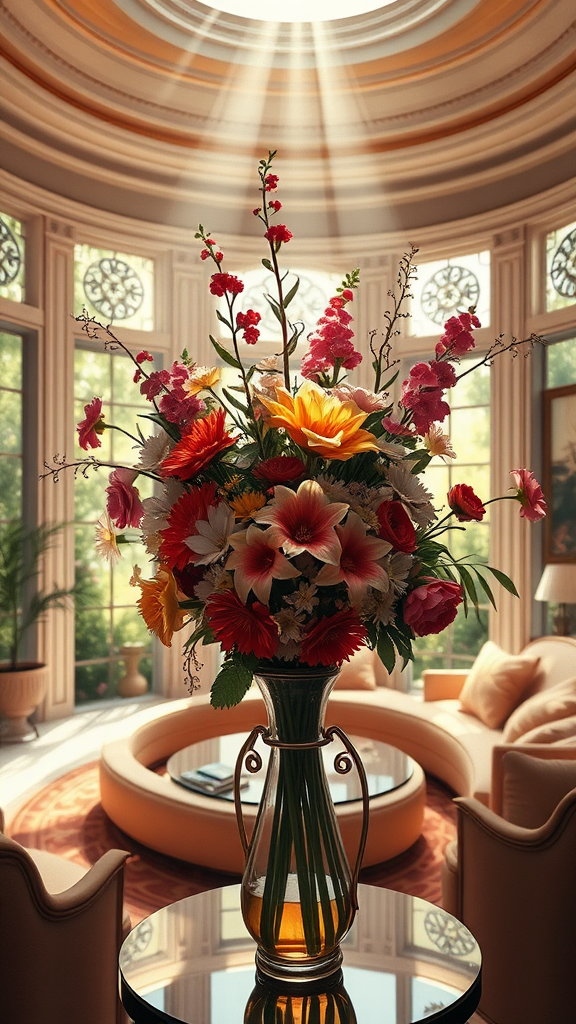 A digital painting of an exquisite bouquet of flowers in a vase, set against an elegant interior design featuring a dreamy sunken living room conversation pit. Small windows open onto a lush garden, allowing beams of bright, soft diffused light to filter through. The room boasts a high ceiling, captured in a wide shot that emphasizes the depth of field. This intricately detailed masterpiece, inspired by the styles of Artgerm, Greg Rutkowski, and Alphonse Mucha, showcases vibrant colors and nuanced textures. The scene is captured in stunning HDR 4k, 8k resolution, highlighting its appeal as a trending piece on Artstation, blending classic art nouveau elegance with modern concept art flair.