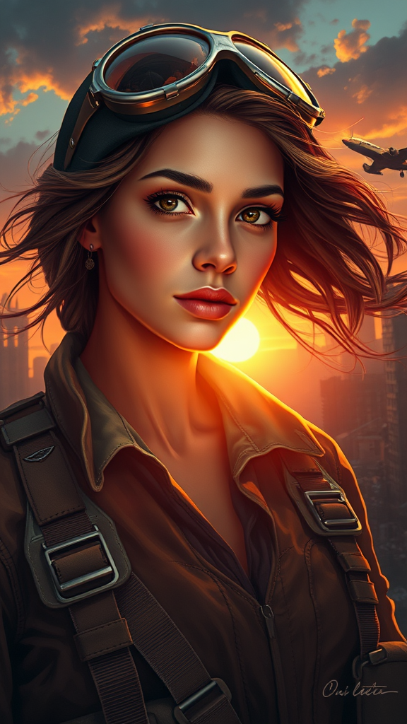 A digital painting portrait of a striking young female aviator with flowing hair, wearing vintage military parachutist gear amidst a dramatic WW2 ruin cityscape at sunset, capturing the essence of resilience and courage with mid-saturation hues, highly detailed textures, and a cinematic film grain evoking a classic movie poster aesthetic.