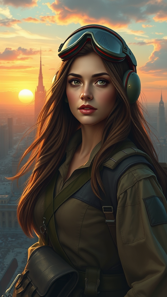 A digital painting portrait of a young and striking military aviator woman with long hair, dressed in detailed parachutist military attire and gear, captured against a dramatic sunset backdrop. The scene is set in a war-torn city from the WW2 era, featuring ruins and remnants of a once-thriving urban landscape. The artwork has a mid-level saturation, highlighting the striking details of her expression and gear, with a touch of film grain for a classic movie poster style effect.