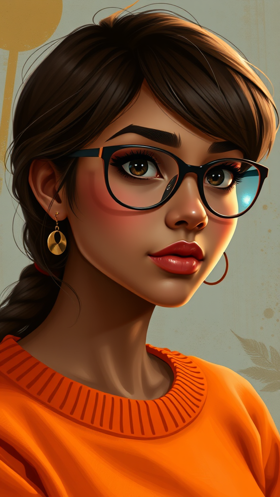 A digital portrait of a South Asian Velma from Scooby Doo with a rich brown skin tone, wearing an orange sweater, featuring sharp focus and dynamic lighting. The artwork is inspired by the style of Emylie Boivin, showcasing ultra-detailed features and a concept art feel. The character is depicted with a thoughtful expression, her glasses reflecting a hint of curiosity. The background includes subtle abstract elements that complement the subject, adding depth and interest to the composition while maintaining the focus on her.