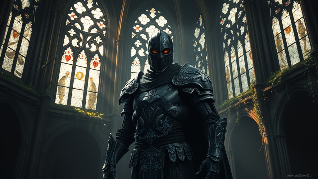 A digital portrait of an undead knight standing in a dimly lit, ancient cathedral. Atmosphere of eerie mystique with intricate gothic architecture, reminiscent of Greg Rutkowski and Ferdinand Knab's styles. The knight is adorned in corroded yet elaborately ornate armor, illuminated by a dramatic play of light filtering through shattered stained glass windows. Vines and moss creep through crevices, enhancing the decay. Shadows dance across the floor, echoing the works of Rossdraws and Tom Bagshaw, while global illumination highlights the knight's hollow, glowing eyes, capturing an ambiance of haunting beauty and sorrow.