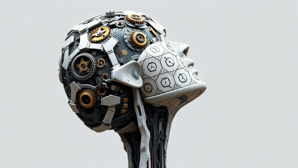 A digital realistic concept art depiction of a head and neck sculpture in slight profile, featuring intricate patterns with visible gears and mechanical elements, blending organic and technological aesthetics. The skin appears as a complex network of geometrical designs and metallic features, creating a contrast of textures. The overall color scheme consists of muted whites, blacks, browns, blues, hints of gold and silver, set against a light gray background. The lighting is soft and diffused, evenly illuminating the subject without casting shadows, emphasizing the sculpture's detailed craftsmanship.