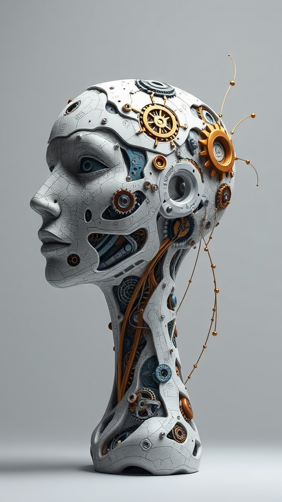 A digital realistic concept art of an abstract sculpture of a head and neck in slight profile, featuring skin comprised of intricate patterns intertwined with gears and mechanical elements, creating a seamless blend of organic and technological aesthetics. The sculpture appears ultra-detailed and photorealistic, showcasing a harmonious palette of muted whites, blacks, browns, blues, gold, and silver. Set against a light gray background, the diffused lighting softly illuminates the piece without casting shadows, enhancing its ethereal quality. Unique elements subtly integrated include delicate tendrils resembling circuitry extending from the neck, with gentle glimmers of light emanating from within, suggesting an inner life and intelligence.