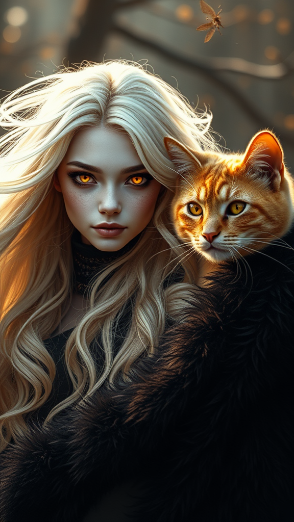 A digital rendering of a captivating portrait featuring a female white cat witch with flowing golden white hair and honey amber eyes that glow like the afternoon sun. She stands confidently amidst her enchanting realm, accompanied by her mystical counterpart, a striking ginger cat with piercing red eyes, exuding boldness and power akin to a wildfire. Together, they are wrapped in a monochromatic fur ensemble, creating a striking contrast. The image captures the intricate details of their fur, enveloped in ambient light and enhanced by volumetric lighting, giving a sense of depth and mystique.